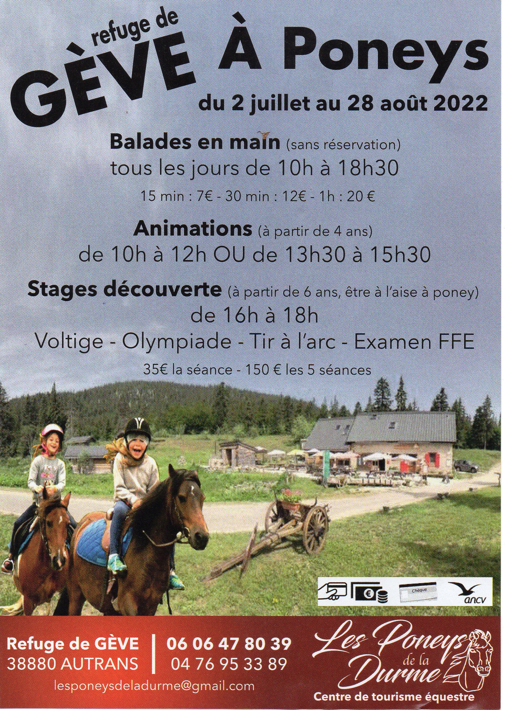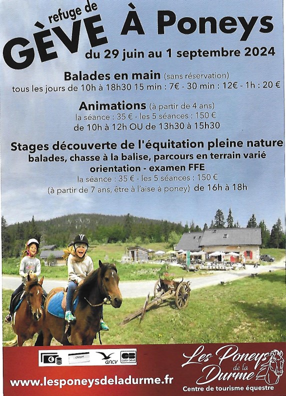 - Animation poney : de 10h à 12h, 13h30 à 15h30 et 16h à 18h tous les jours